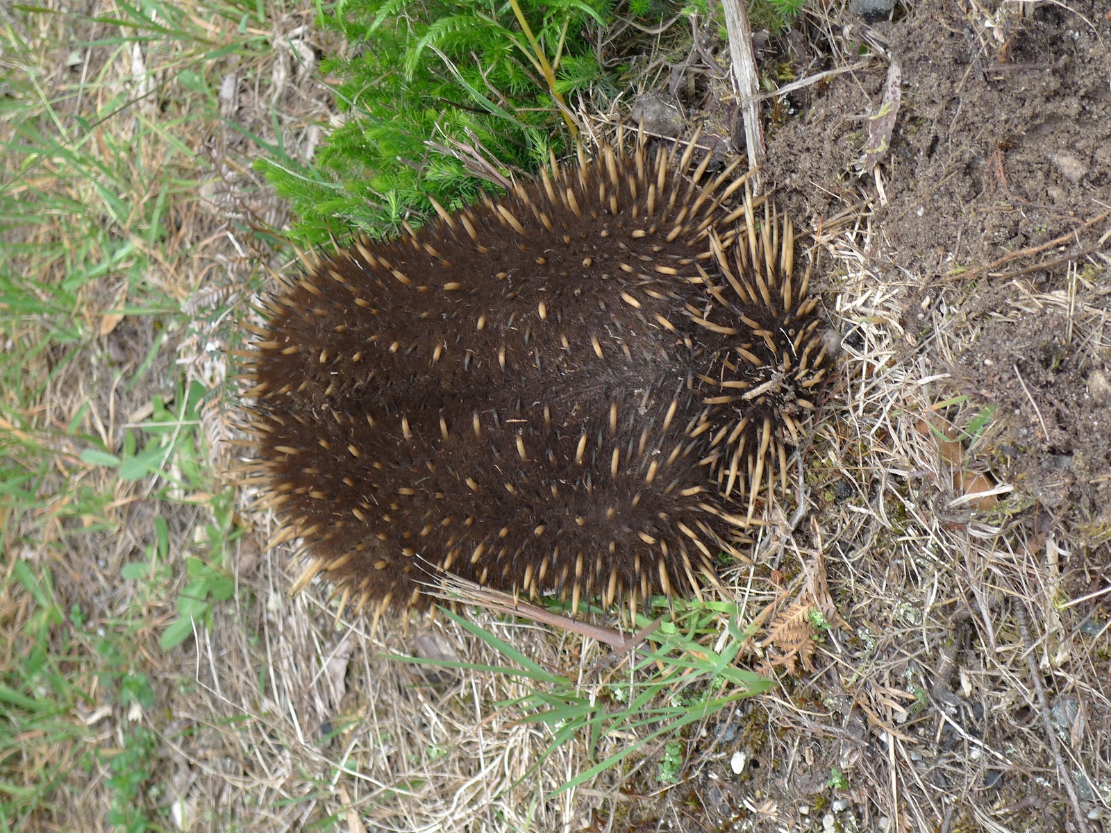 | This little fellow is trying to disappear into the ground. He's an Echidna (Spiny Anteater), one of only two monotremes, egg-laying mammals. The other is the platypus. |